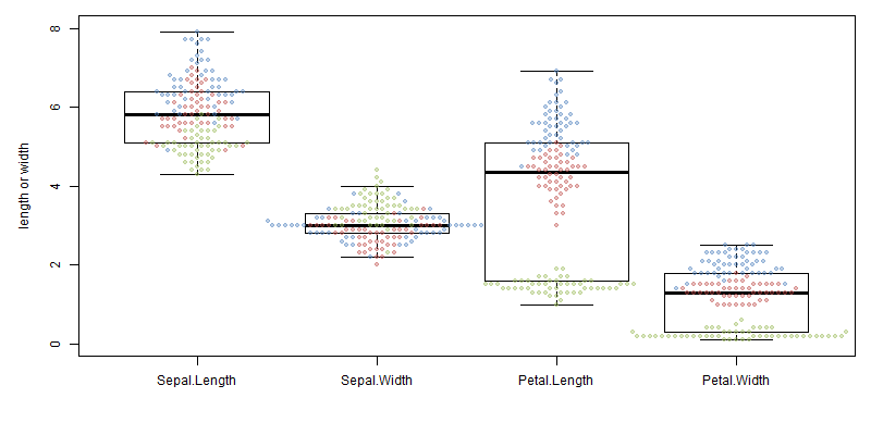 library(beeswarm) setwd("path\\to\\pngfile") png("boxplot_iris.png", width = 800, height = 400) par(mar = c(5, 5, 1, 1)) Data.Iris <- iris Data.Iris[,6:9] <- iris[,5] Point.Color <- c("#9bbb5960", "#c0504d60","#4f81bd60") Species.List <- as.character(unique(Data.Iris$Species)) for(i in 1:3){ Data.Iris[6:9] <- sub(Species.List[i], Point.Color[i], Data.Iris[,6]) } colnames(Data.Iris)[6:9] <- "Color" boxplot(Data.Iris[1:4], ylim=c(0,8), ylab = "length or width", outline = FALSE) beeswarm(Data.Iris[1:4], add = TRUE, pwcol = Data.Iris[6:9], pch = 20) dev.off()